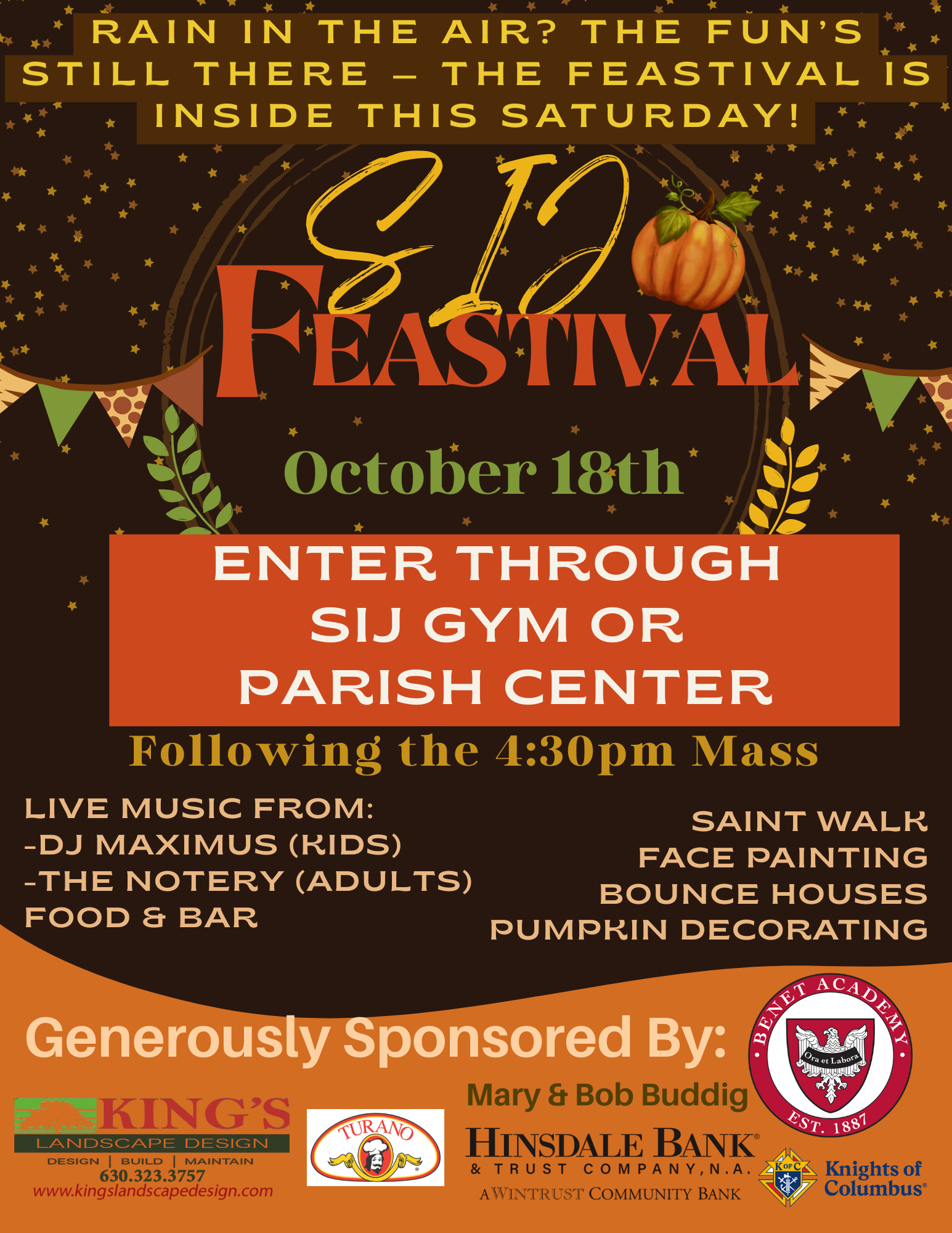 Join us for the 12th Annual Feastival of St. Isaac Jogues on Saturday October 18th, from 5:30-9:30 pm! Due to rain, the event will be INSIDE. You may enter through the Gym or Parish Center. for great food, drinks, live music, and fun for the whole family. There's something for everyone at this unique, family-friendly event!
